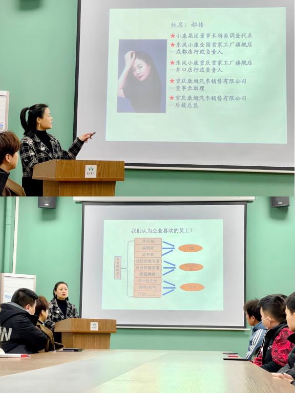 讲座伊始,郝助理首先通过自己的亲身经历,生动地介绍了自己走进重庆康旭汽车销售有限公司之前所面临的不同阶段的职业生涯选择。并且满怀激情地向同学们讲述自己是如何同企业一起成长,走到了目前的高管岗位,从自身的教育背景与切身的职业经历来帮助同学们明晰职业生涯规划的重要意义。并告诫同学们在大学期间应该培养哪些优秀的品质,让自己在未来能为成为企业“抢手的人才”。