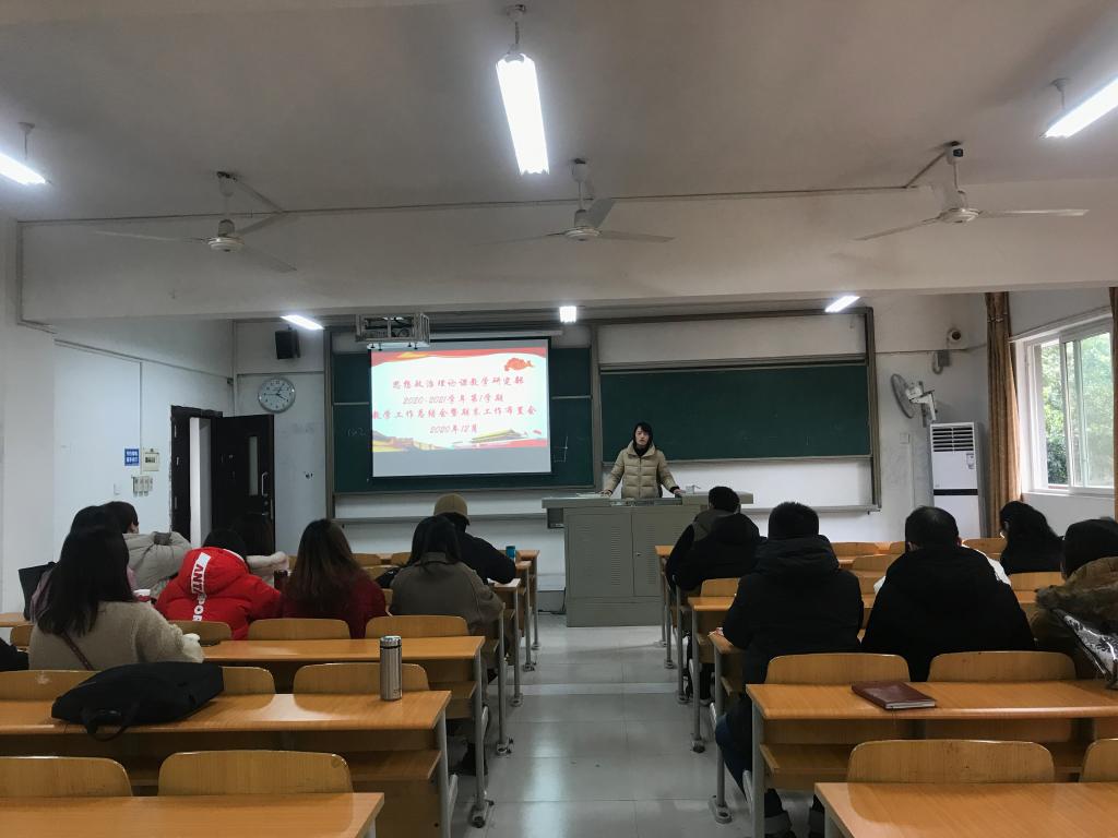 邓燕主任首先对教学部全体教师今年的辛勤工作给予了充分肯定,希望教师们再接再厉,再创佳绩。同时邓主任对近期的工作做了安排部署:一是做好期末工作,她希望各位老师既能开好头又能收好尾,紧抓期末工作的关键环节,务必以认真、严谨的工作态度保质保量的完成期末工作;二是加强督导工作,做好“老带新”工作学期总结,进一步助力新教师业务能力的提升;三是强调了学校近期疫情防控的最新要求,希望各位老师务必严格遵守学校相关要求,认真落实到位;四是要求各位教师要紧密围绕“立德树人”根本任务,紧扣学校“信息产业商学院”的办学定位,不断拓展思路,锐意创新,加强实践,进一步提升思政课教育教学质量,提升育人实效。