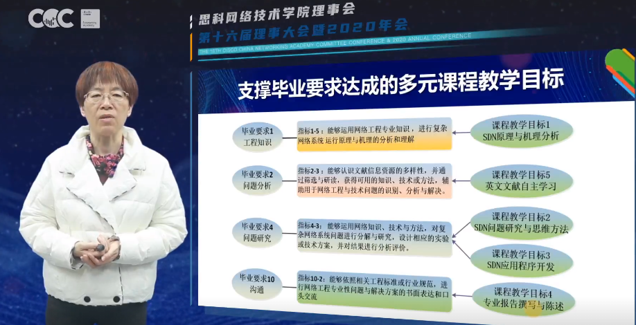 在下午的本科院校分会场会议中,高校网院专家教授进行了本科院校产教融合、课程建设、案例分享等经验分享与交流。15时,教育部高校教指委专家施晓秋教授重点介绍了温州大学以“产教融合为契机,促进高校一流课程建设”的方案,分享了支撑毕业要求达成的多元课程教学目标改革的成功案例。电子科技大学专家教授杨宁、中国石油大学肖军弼教授围绕学校开设课程,详细讲解了如何将思科网院项目课程内容融入到高校课程相关内容中。最后,加拿大思科网院分部分享了加拿大亚岗昆学院的产教融合案例。