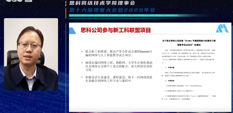 思科网络技术学院理事会第十六届理事大会暨2020年会于2020年12月12日上午9时隆重召开。受疫情影响,本次年会首次线上开启,采取全程直播形式,突破地理限制,任何地点、任何终端、随时访问。全国范围内参会高等院校100多所,我校大数据与软件学院副院长闫会峰、向碧群、教研室主任吕云山应邀参加。在年度奖项评选中,我校荣获 “年度十佳网院”。