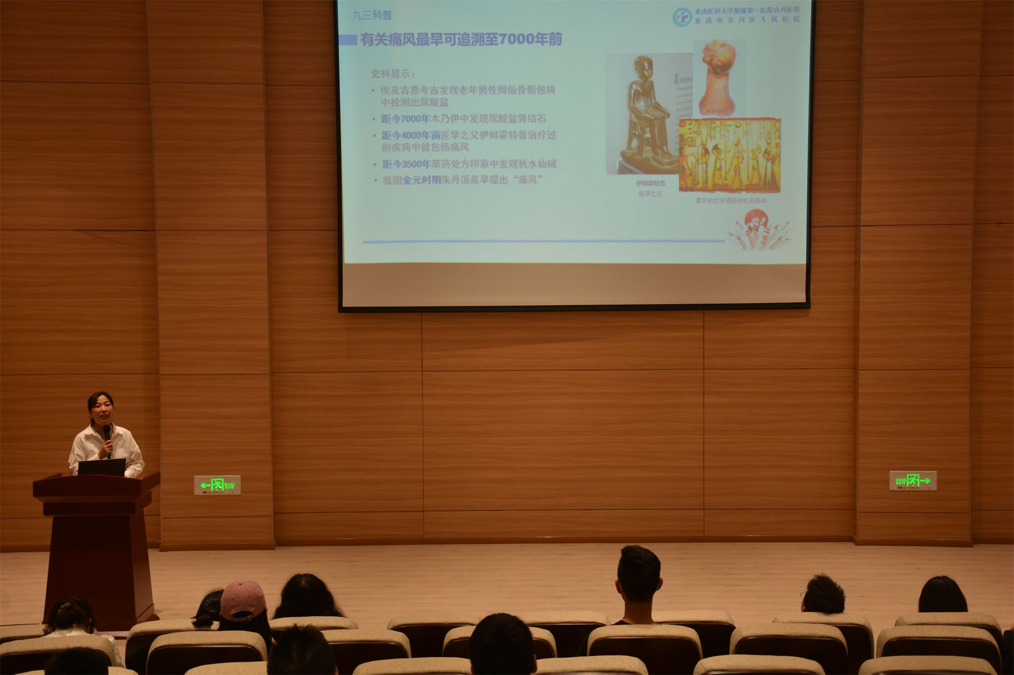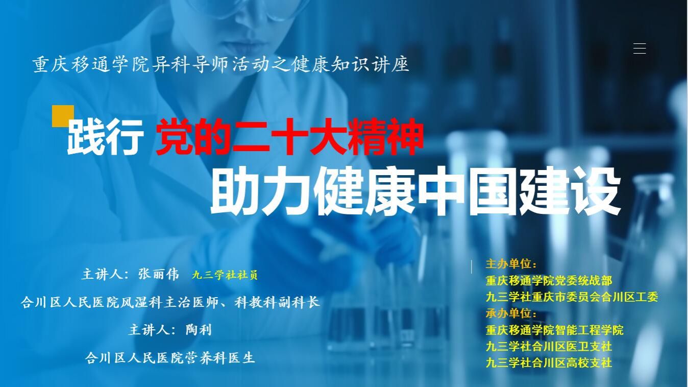 4月19日,为深入贯彻中共二十大推进健康中国建设要求,结合“世界痛风日”宣传,倡导在校大学生形成有利于身体健康的生活方式,重庆移通学院党委统战部联合九三学社重庆市委员会合川区工委于我校六度空间创梦空间主办了以“践行党的二十大精神、助力健康中国建设”为主题健康科普活动。活动以健康知识讲座为主要内容,活动由重庆移通学院智能工程学院、合川区医卫支社委员会和九三学社合川区高校支社委员会承办,智能工程学院青马工程学员、学生党支部党员参与聆听讲座学习,为近100名大学生科普了痛风常识以及营养膳食的健康知识。