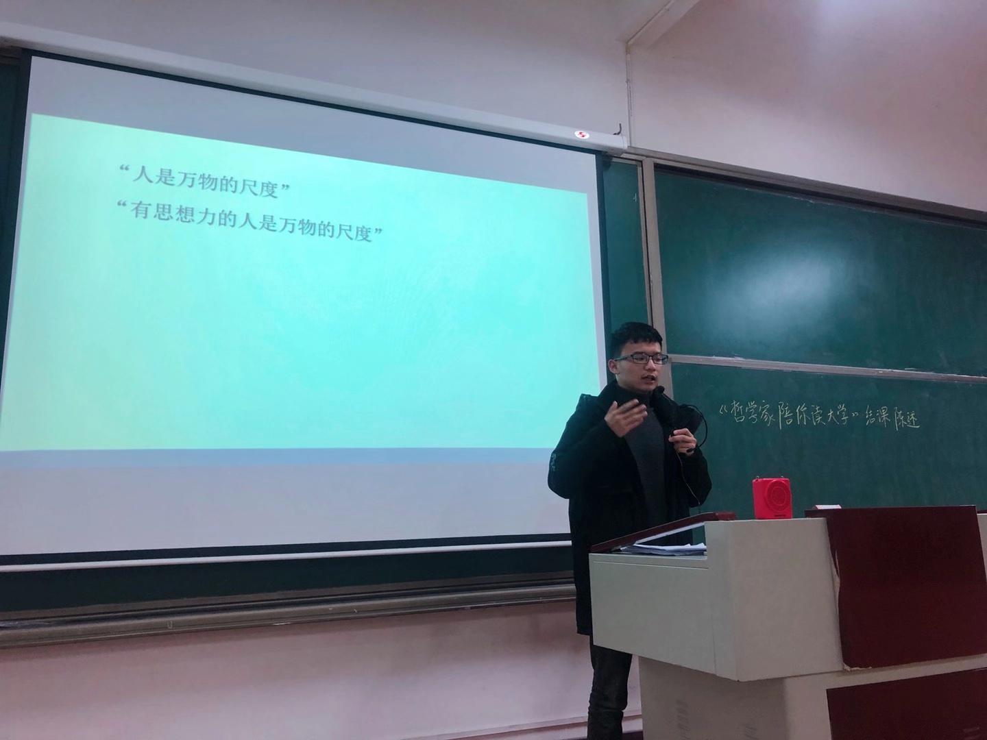 “每次课,一个个不同的哲学问题,看似没有太多的联系,但是在我心中完美地连成了两个字——“生活”。每个人的价值、自我、爱情、道德、悲喜、审美都是不同的,它们构成了一个独立的人,构成了每个人截然不同的生活,所以我们要做的就是认清自己,掌握自己的生活,我的大学我做主。”