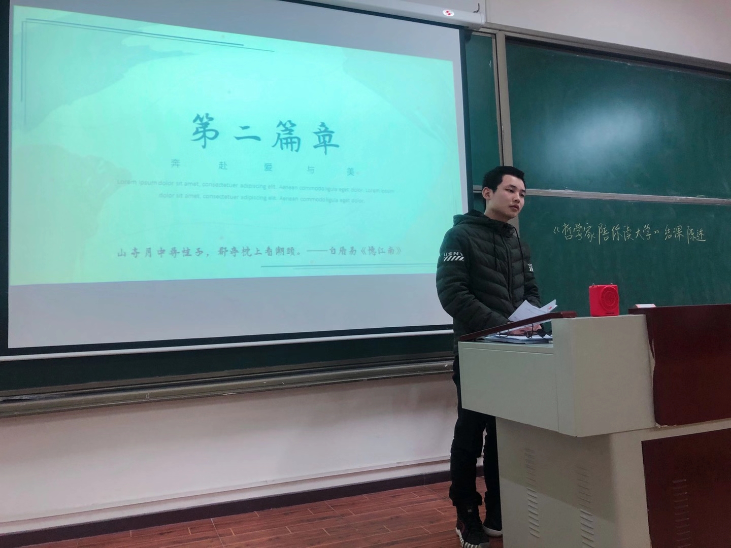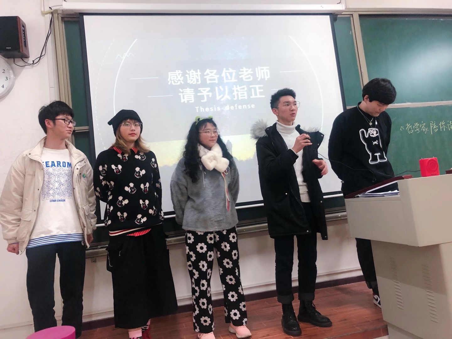 通过一学期的学习和讨论,最后一次课,每个小组同学都带来各自准备的主题陈述,如“生活的意义——‘积极的丧着’是一种好的选择吗?”、“道德与法律——人的尊严从何处体现?”、“奔赴爱与美——我需要做好怎样的准备?”、“哲学与价值——什么叫无用之大用?”等等,主讲同学在讲台前借助PPT陈述之后,小组所有成员共同回答同学和老师的问题,随后,李娇老师和陈明波老师进行点评,同学间会进行朋辈互评,这样的结课方式,让每一位同学都全心投入,印象深刻。课程结束后,同学们或从这门课培养自己的能力入手或从这些主题对自己成长的意义入手或从哲学的价值入手,谈了这门课对自己的影响和作用。