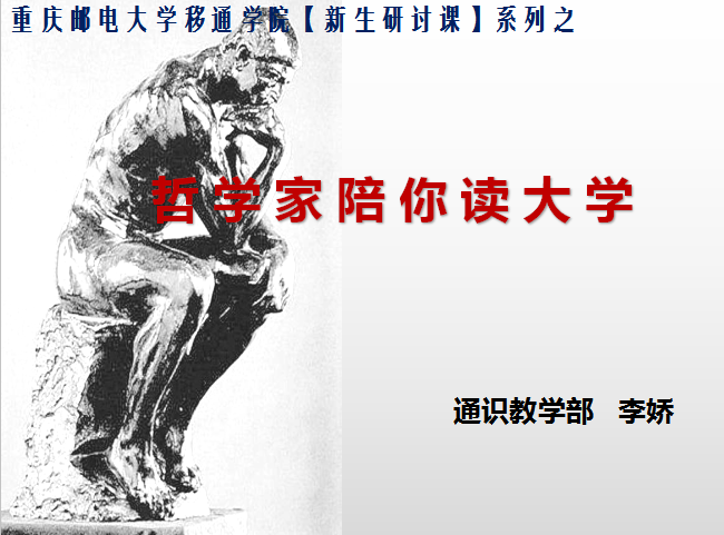 《哲学家陪你读大学》是通识教学部面向大一新生开设的一门研讨课,旨在通过讲解哲学家的思想,借助哲学家的经典话语,来解答学生现实生活中的一些困惑,使其更深刻地理解生活和学习,缓解心理压力,为过好大学生活以及今后的生活储备知识、能力和素养。同时,在研讨课上,引导学生自主查阅资料,分小组探讨问题,课堂分享反馈等方式培养学生的学习习惯,使学生理解学科知识融会贯通的意义所在,并从多个角度收获知识和能力。