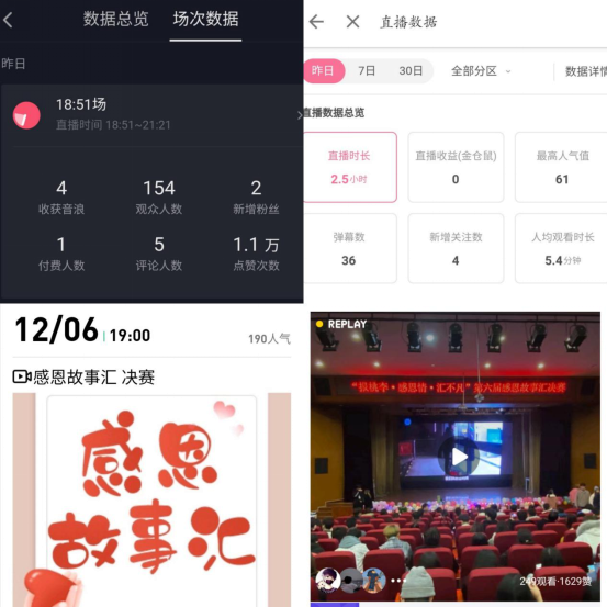 本次感恩故事汇采取线上线下相结合的方式进行,在官方QQ、抖音短视频、哔哩哔哩以及微信小程序看点直播四个直播平台同步直播,总计观看人数达600余人,点赞次数达1.2万。活动正式开始之前,同学们在剧场外围感恩墙上进行留言,可能只有短短几句话,却汇集了千丝万缕的情感。