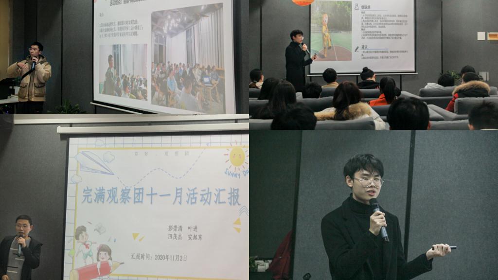 各小组一一汇报结束后,完满观察团副主任谢银平老师就11月观察团工作进行总结,向观察团成员们表示赞扬,并向大家分享观察团语录:活动并不是孤独的,要学会在活动中建立桥梁。一场活动举办成功的标志,表现在很多方面,刘小路老师在汇报中也提出了细节的重要性,细节决定成败,观察团小组们也纷纷提出自己的观察团语录:
