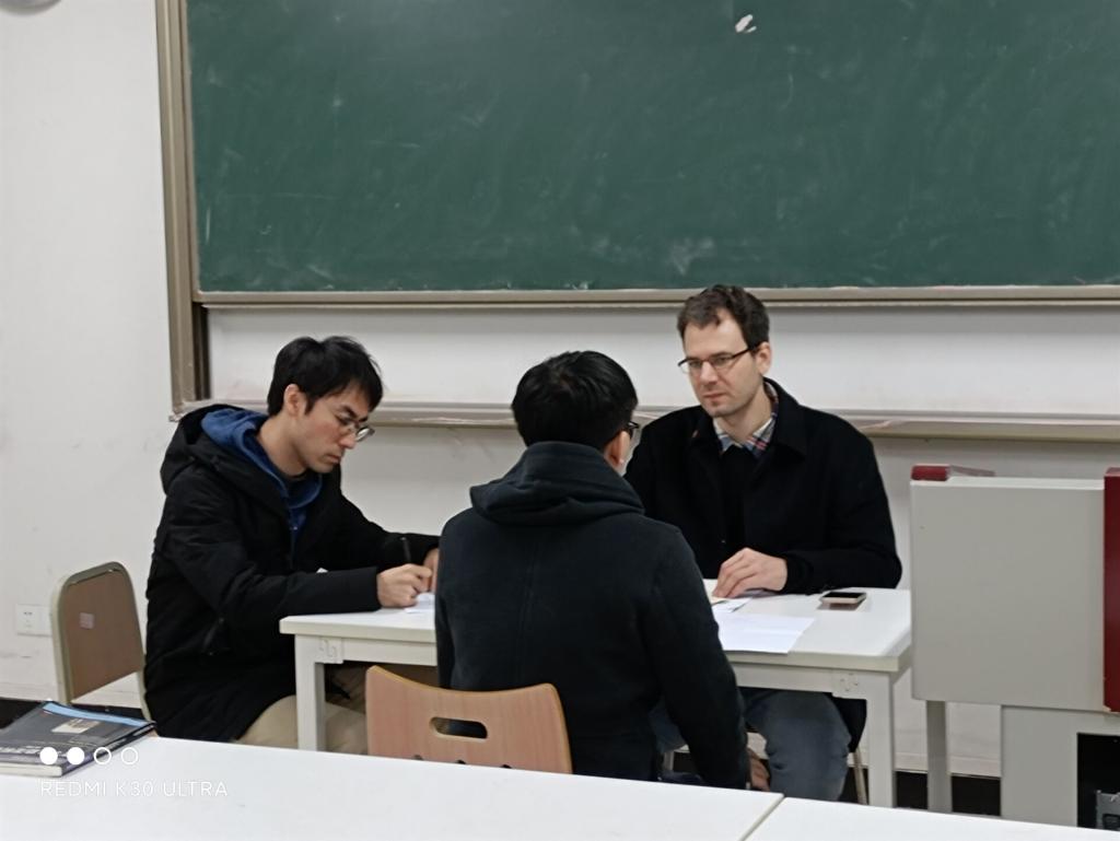 在模拟面试环节中,主考官由德籍外教Elias担任,中方德语教师担任助理。Elias对每位同学的表现做了精辟细致的记录和点评。他称赞了同学们的表现,同时也对诸多不足之处提出了相应的建议。