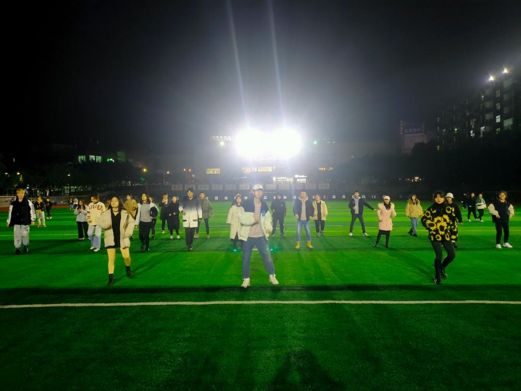 准时开场的广场舞,像是一场美丽的约定,智慧八班的智慧果果们和多名特约的伙伴如约而至。为推进同学们快速学习相关舞蹈,本次活动特地邀请啦啦操与排舞协会的同学作为本次活动的领舞者。绿茵场上,前排娴熟律动的领舞动作,身后是近三十多名大学生伴随着音乐模仿者领舞同学的舞姿,嬉笑着舒展开自己的身体,并时不时与同伴相互打趣,欢乐一片。