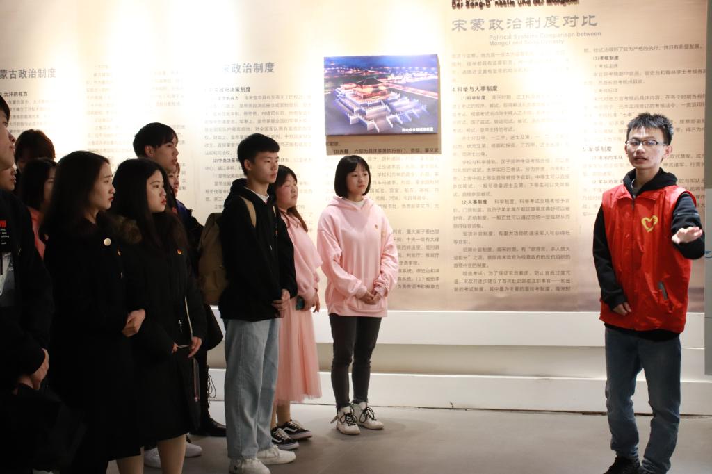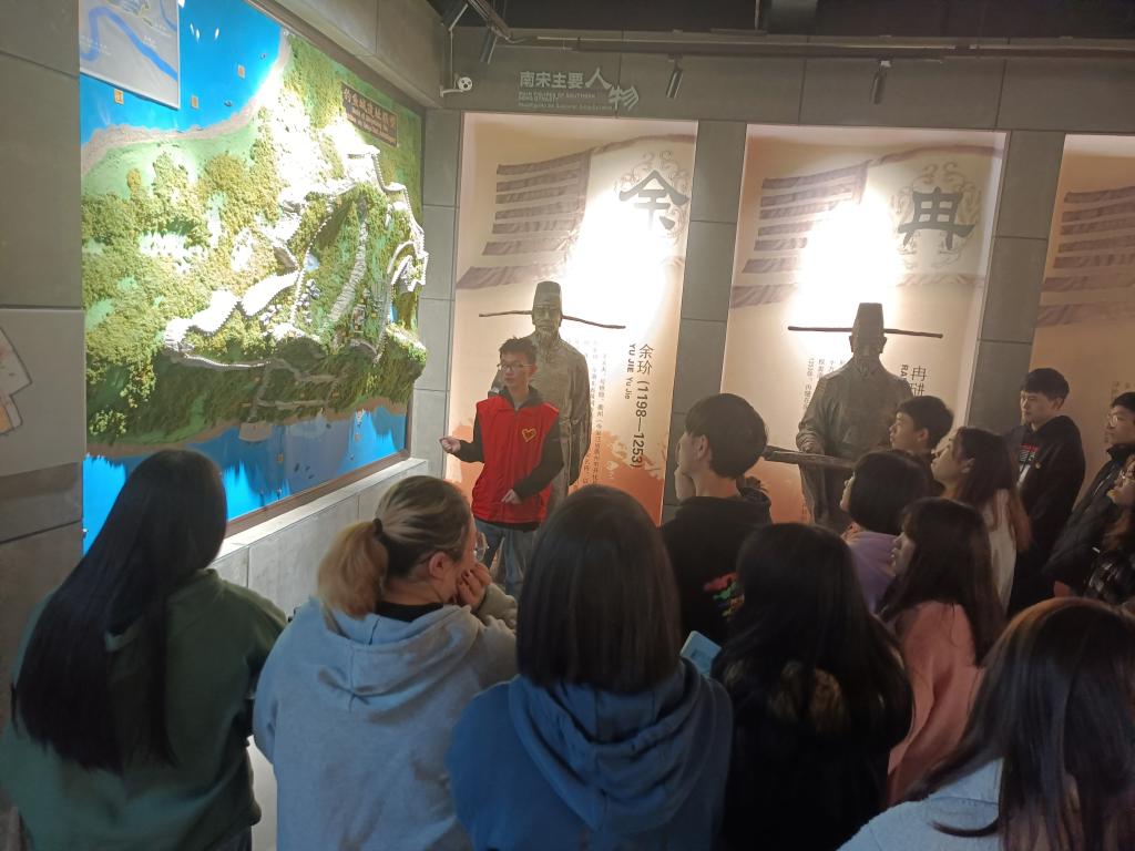 来到二楼展厅,从公元1231年到公元1279年这四十八年宋蒙战争中的“大事记”由讲解员娓娓道来,其中穿插了“王坚偷袭护国门和西北外城的蒙古都总帅汪德臣激战获胜”,“王坚夜袭蒙哥汗御营”等爱国将士们的故事,同学们从中也有所感悟,为在钓鱼城战争中奋战的将士们英勇无畏的精神所浸染。后讲解员从当时多国并立的政治格局展开,在政治、经济、文化、宗教等多个方面分析宋蒙间实力对比,继而在“战争烽烟”板块下介绍钓鱼城在四川山城防御体系中的战略地位,向同学们阐述了钓鱼城之战之所以坚守三十六年的根源。短短的话语道不尽鱼城之史,但七百多年前钓鱼城军民保家卫国的爱国精神却已深入同学们的心中。