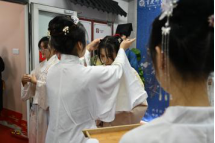 汉民族自古就有成人礼,伴随着时代的跨变,成人礼的形式也与时俱进。在此次活动中,由有司带领冠者和笈者进场,正宾卢柯敏、徐秋月老师亲自为冠者带冠、笄者戴玉簪,此刻预示着他们已跨入成人阶段,应为自己的行为负责。“长风破浪会有时,直挂云帆济沧海”,铿锵有力的宣誓,表明他们对未来充满信心。