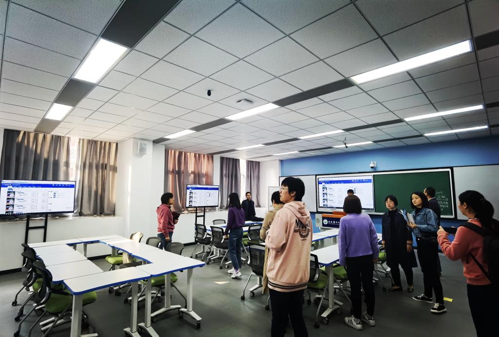 随后教务处冉老师带领大家参观了智慧教室,介绍并演示了智能设备和一体化教学应用云平台的各项功能。冉老师表示,云平台在疫情期间为学校教学起到了至关重要的作用。此外,对于中外合作办学的项目,目前由于国外疫情而无法入境现场教学的英方教授可以通过云平台在智慧教室为学生互动授课,避免耽误教学进度还能保证教学质量。我校调研团队老师们不仅对云平台以及硬件设施的优缺点做了进一步询问和了解,还亲自参与互动投屏功能的体验,以便更加直观地感受智能云平台的使用效果。