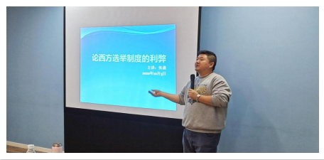 在本次“悦”读分享会中,首先由张晟老师谈西方政治的利弊。老师介绍了美国的三权分立制度。三权分立为行政权指政府,立法权指国会的上下议院制度,司法权指法院,三者互相制衡。