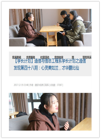 通信与物联网工程学院学长计划之通信发现第四十八期“心灵美如兰,才华馥比仙”将完满达人的分享与学长计划相结合,通过采访的形式将完满达人李浪在完满之路上的事迹和精神一一发掘出来,并以跟踪采访稿的形式广泛宣传散播,告诉同学们要勇敢去面对生活中的各种挫折,学会自强自立,自己解决问题。