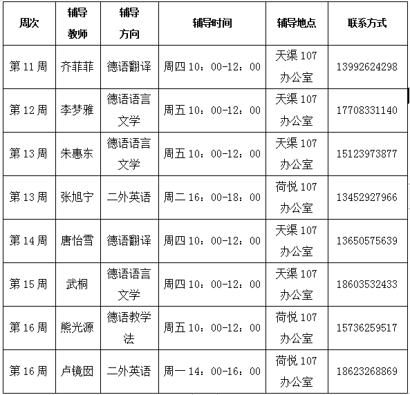 2021年全国硕士研究生招生考试初试时间为2020年12月26日至27日,目前学生备考已进入冲刺阶段。为了帮助学生更有针对性地进行复习冲刺,各位老师对考研辅导工作的思路和方法进行了交流和讨论,决定对考研学生开展专项辅导答疑工作。各位老师结合自己的专业方向,协商制定德语专业考研辅导安排表如下: