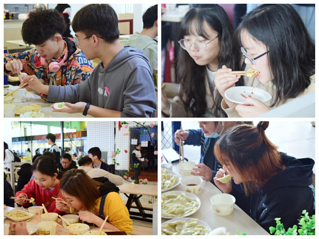 活动现场氛围很热闹,我和几个好朋友都不是特别会包饺子,特别是作为一名男生,确实有点“外行”。但总体来说,我们吃到自己亲手包的饺子还是很幸福的。每一张桌子的同学都亲自动手,享受温馨的过程和美味,着实是大学里面比较难得的机会。希望这个立冬饺子节能够年年延续,给更多的同学在传统节日节气送去问候,带去温暖。