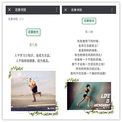 针对以上情况,为了加强和改进学生的身心健康,增强体育锻炼意识,培养健康的生活习惯,促进学生身心健康成长。从2018年5月开始,花果书院利用黑板报、公众号等平台向移通学子宣传“花果健康课”主题活动。黑板报和公众号的宣传内容涵盖体质测试的重要性及标准、良好的生活习惯及宿舍习惯、大学生膳食指南、身心健康的重要性的等多个方面。花果书院利用线上线下两个平台,向移通学子展示体质测试带来的好处,怎样才能称为健康的生活,健康生活能带来的好处。在5月23日的花果周报宣传中,我们可以看到一些很适合我们在校大学生的健康生活小知识,例如:拒绝垃圾食品、少吃外卖、多喝酸奶、多运动、坚持快走等。除此之外在花果书院微信公众号里也在不断更新健康生活知识、健康生活作息表等。通过一系列的宣传,很多同学了解到通过体质测试,可以让我们提前了解身体的状态,在疾病来临之前,尽早地调整生活习惯的道理,决定认真对待难得的体测机会。