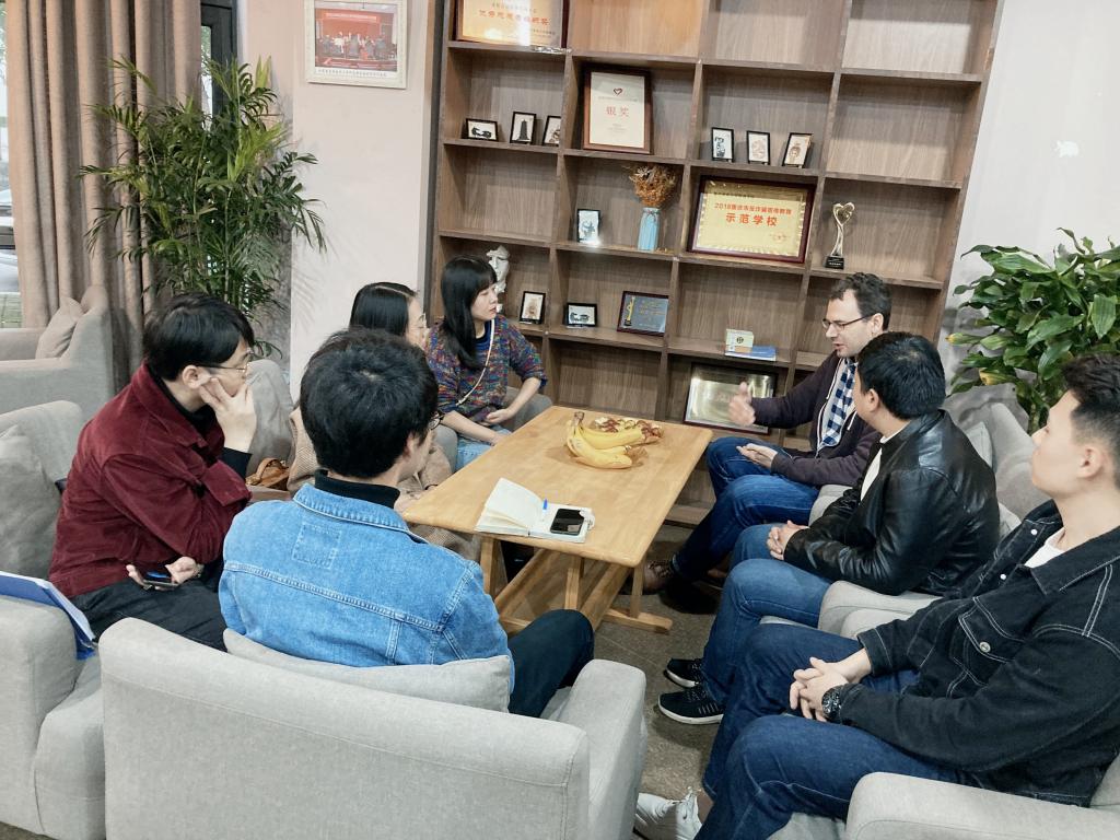 会议期间,中方教师与Elias先生就德语口语课程内容、教学方法等方面进行了广泛而深入的交流,以寻求课堂教学的更好切入点,Elias向大家推荐了一个名叫“Tabu”的口语课堂小游戏。会上老师们踊跃发言,交流气氛热烈浓厚。秦艳老师在会议中强调,德语口语课可以通过丰富多样的课堂形式,利用课外学习软件和发展兴趣爱好等方式达到提升教学质量的目的,如引进互动式课堂、在课上进行角色扮演、情景模拟等,让学生有更多参与感。王琥老师则建议,提升学生德语口语水平,首先要鼓励学生多开口、敢开口。可以利用《每日德语听力》等软件,进行课外听说练习,将教学内容与学生感兴趣的事物联系起来,提高学生对德语学习的兴趣。