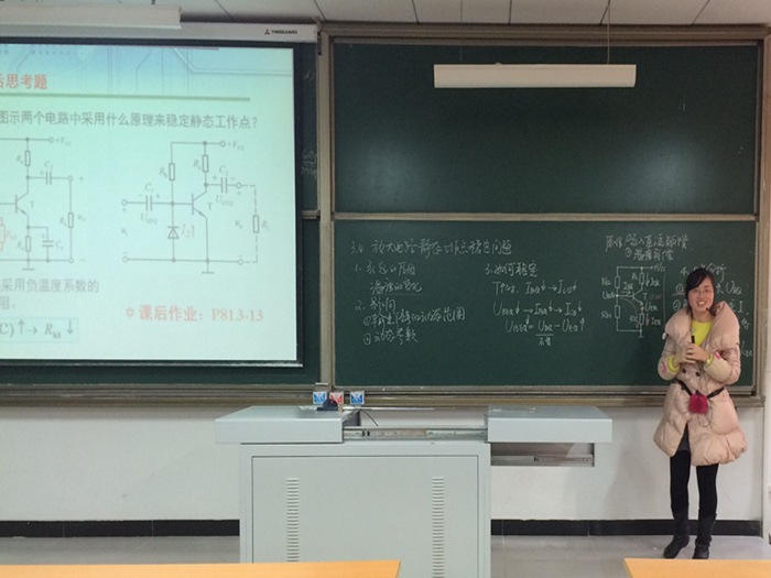 张媛老师在讲课中体现了较高的课堂教学技巧。从引起静态工作点不稳定的因素到静态工作点不稳定会产生的影响,从提出稳定工作点的办法到建立电路结构以及电路的分析,整个教学过程,知识点层层递进、环环相扣、逻辑清晰、表达准确,深入浅出。电子课件制作精美、动画运用合理;板书精心设计,关键信息一目了然;讲课声音抑扬顿挫,富有韵律,形体动作张弛有度,富有美感,整个课堂始终能抓住听者的注意力,体现了良好的个人素质。