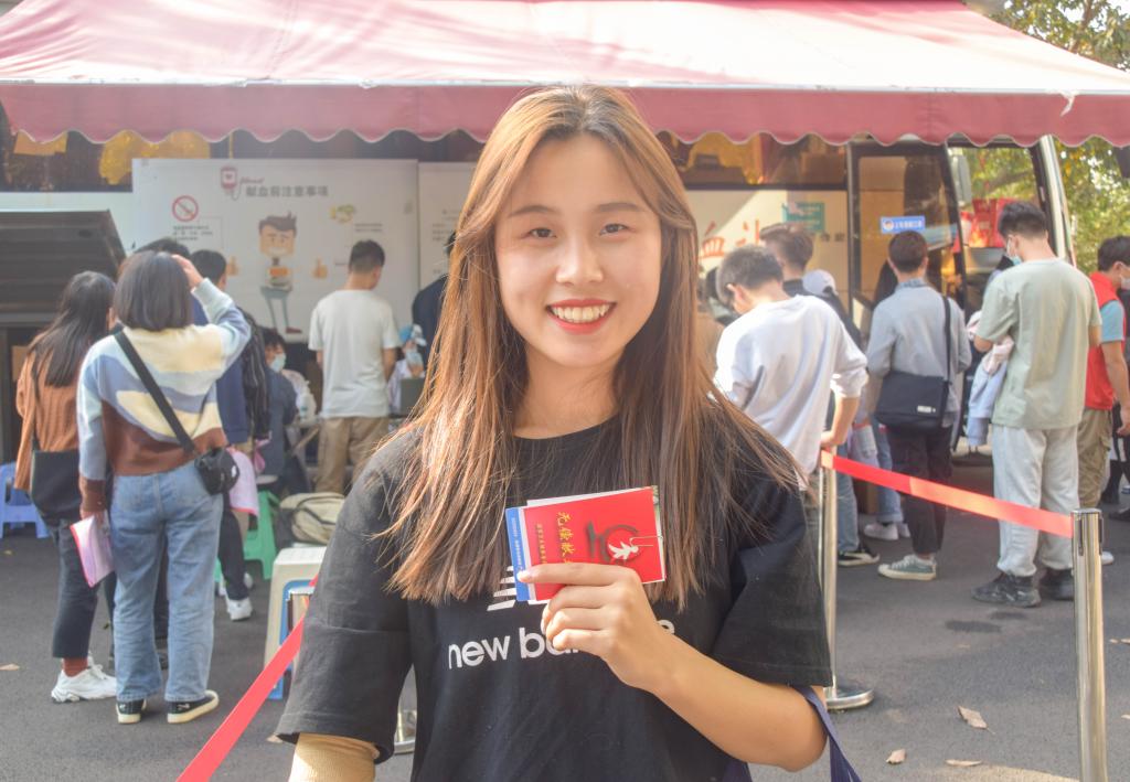 “在献血车上我负责为同学们提供葡萄糖水,他们献血完毕后我需要及时搀扶他们到旁边的凳子上休息,在看到他们从上车时的略微紧张到献血时脸上露出的温暖笑容,有一种感动油然而生。我想这就是志愿服务的精神所在吧。”