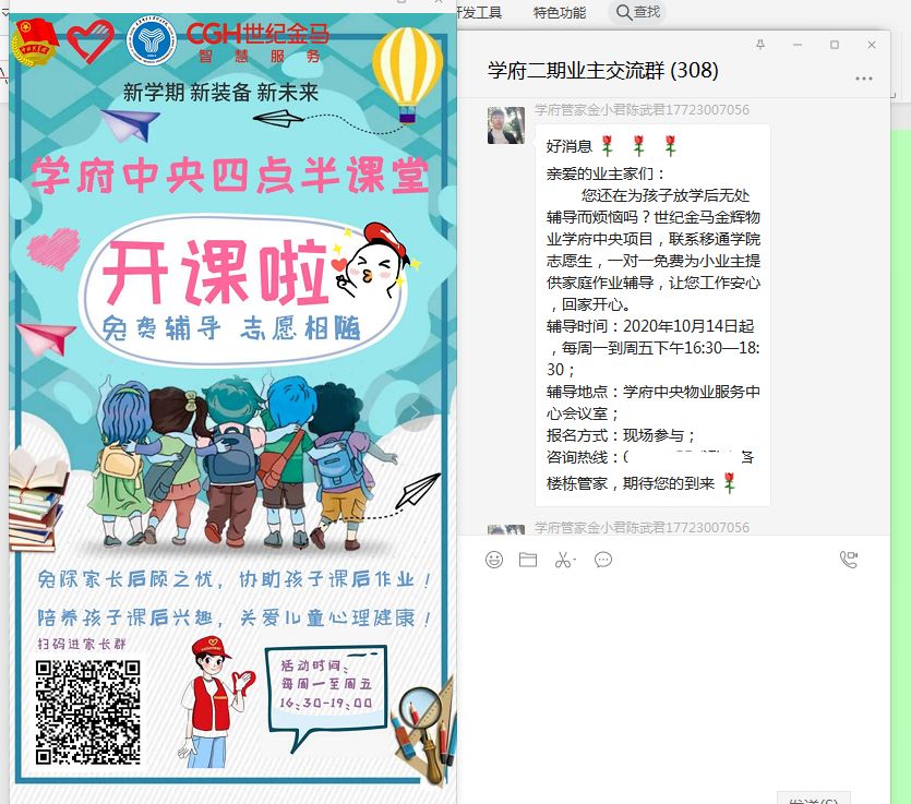 在活动前期,为加大宣传力度让小朋友充分了解参与此活动,志愿者们提前做好宣传海报并与世纪金马小区负责人进行宣传方案商讨,物业群通知、宣传单发送、海报粘贴...通过线上线下共同发力宣传,呼吁更多的小朋友加入四点办课堂。并对志愿者也进行了相关培训以及详细分工,以便活动进行更加秩序化、规范化。