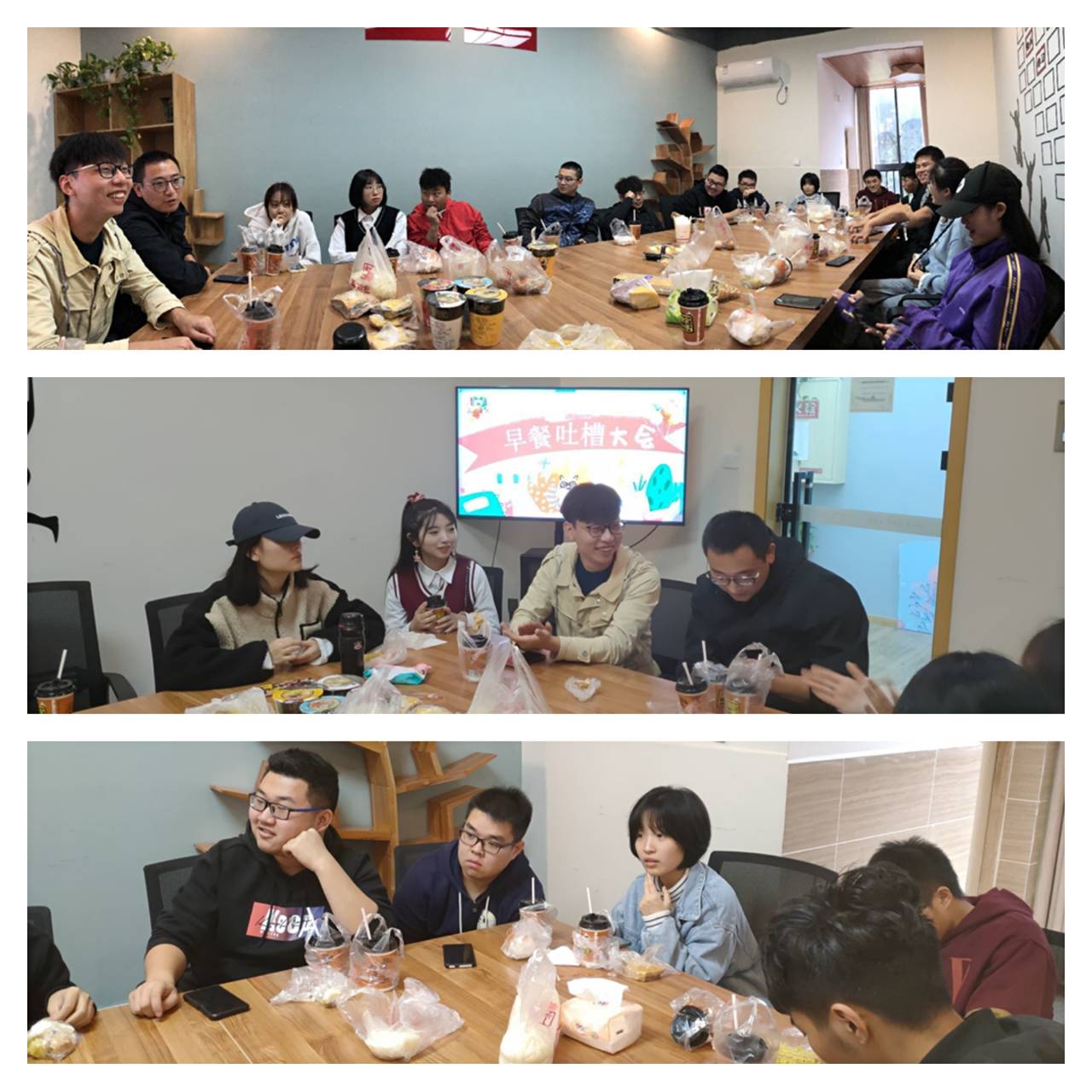 一年之计在于春,一天之计在于晨,美好的一天从早上开始。结合书院家文化氛围营造,将“传承”持续下去,从学生干部开始;10月17日的早晨,安静的廊桥书院2号楼学生工作室摆满了丰富的早餐,9点整,书院老师们与一届四任的干部们聚在一起,开启了第二届的吐槽大会,共计18人参会。