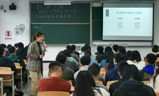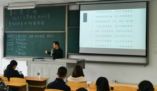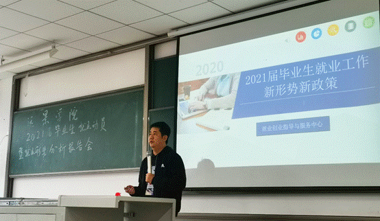当前,大学生就业问题已成为关系广大学子前途的首要问题。在今年特殊的情况下,远景学院为了让2021届毕业生消除就业中的困惑,进一步帮助同学们树立正确的就业观和择业观,使广大学生了解就业形势,转变就业观念,提高就业技能,2020年10月16日上午10:00在5504教室举办了远景学院2021届毕业生就业动员暨就业形势分析报告会。出席本次动员会的有学校就业创业中心主任陈仲华、远景学院执行院长皮若兰、学工副院长李军、学工办主任郭淼、毕业班辅导员陈淑涵以及远景学院2021届全体毕业生。