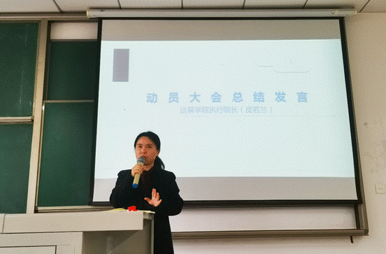 最后,皮若兰院长对本次动员大会进行了总结发言。希望同学们既不要盲目的自信,也不要盲目的自卑。提醒大家要认清就业形势、调整就业预期、做好就业准备,合理对待工作岗位与自己理想工作的差异,为毕业生摆正心态,积极进取,未来升职提出了宝贵建议。同时也相信同学们经过远景学院的特色培养,在拥有行业发展、国际关系、多学科交叉的眼光与格局下,一定能做好职业定位,找到自己发展的方向。