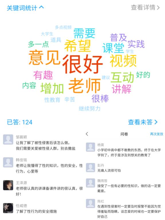 课程最后,杨老师用学习通app进行了问卷调查,一共有124名学生参与。其中男生78人,占62.9%,女生46人,占37.1%。在参与调查的学生中,有21%的人正在谈恋爱,16.9%的学生表示他们有过性行为,73.4%的学生可以接受大学生婚前性行为,而在大学生性教育方面,学生觉得最需要的是性心理和性安全教育。这一点也可以从学生采取的避孕措施中可以看出,只有一半的学生会在性行为中采取戴安全套的方式避孕,另外40%的学生会采取计算安全期、体外射精、紧急避孕药等方式,甚至还有10%的学生在性行为中不采取任何避孕措施。可见,学生的性安全意识多么的薄弱。