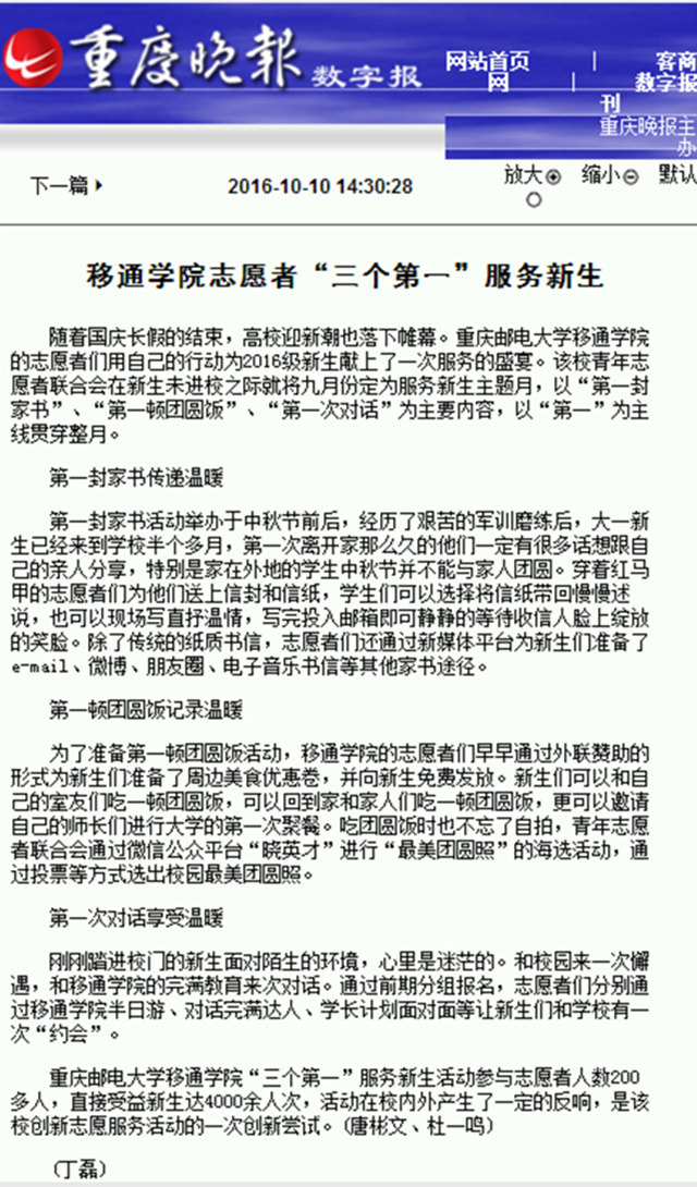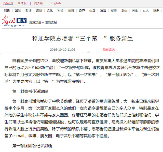 近日,由我校完满教育志愿服务板块举办的“三个第一”服务新生活动受到光明网、重庆晚报等媒体关注报到,在校外形成一定反响。