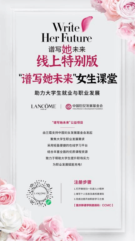 我们希冀此次课程能给大家带来一定的收获。课程结合当下疫情大背景,帮助各位大学生,特别是即将踏入社会的女大学生,提升自身职业素养,通过线上学习各种职场技能,以后步入职场也能坦然自若,展现芳华。