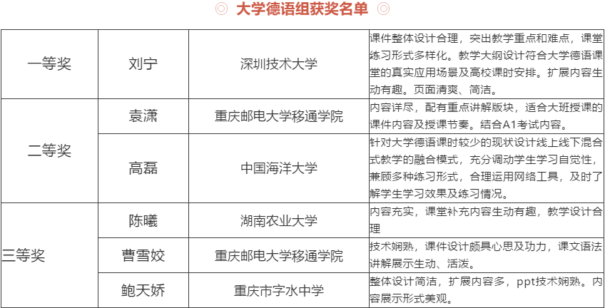 中德学院两位教师的课件作品内容完整,板式简洁明了,节奏明确,以生动活泼的形式降低了学习内容的难度,将音频、图片和视频等内容恰当合理的融入了课件中;语法讲解清晰明了,紧扣教材,获得了众多评委的高度评价。