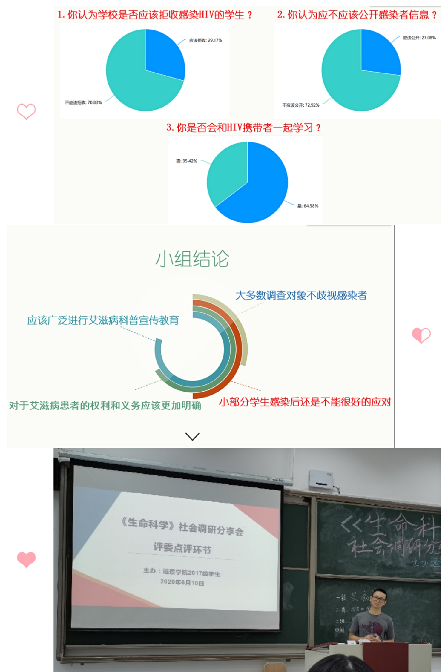 2020年6月10日,远景学院《生命科学》教学1班的学生在3203教室开展了“《生命科学》社会调研分享会”活动。全班18位同学分为4个小组,从“艾滋病”“熬夜”“器官移植”“安乐死”4个方面进行调研汇报。