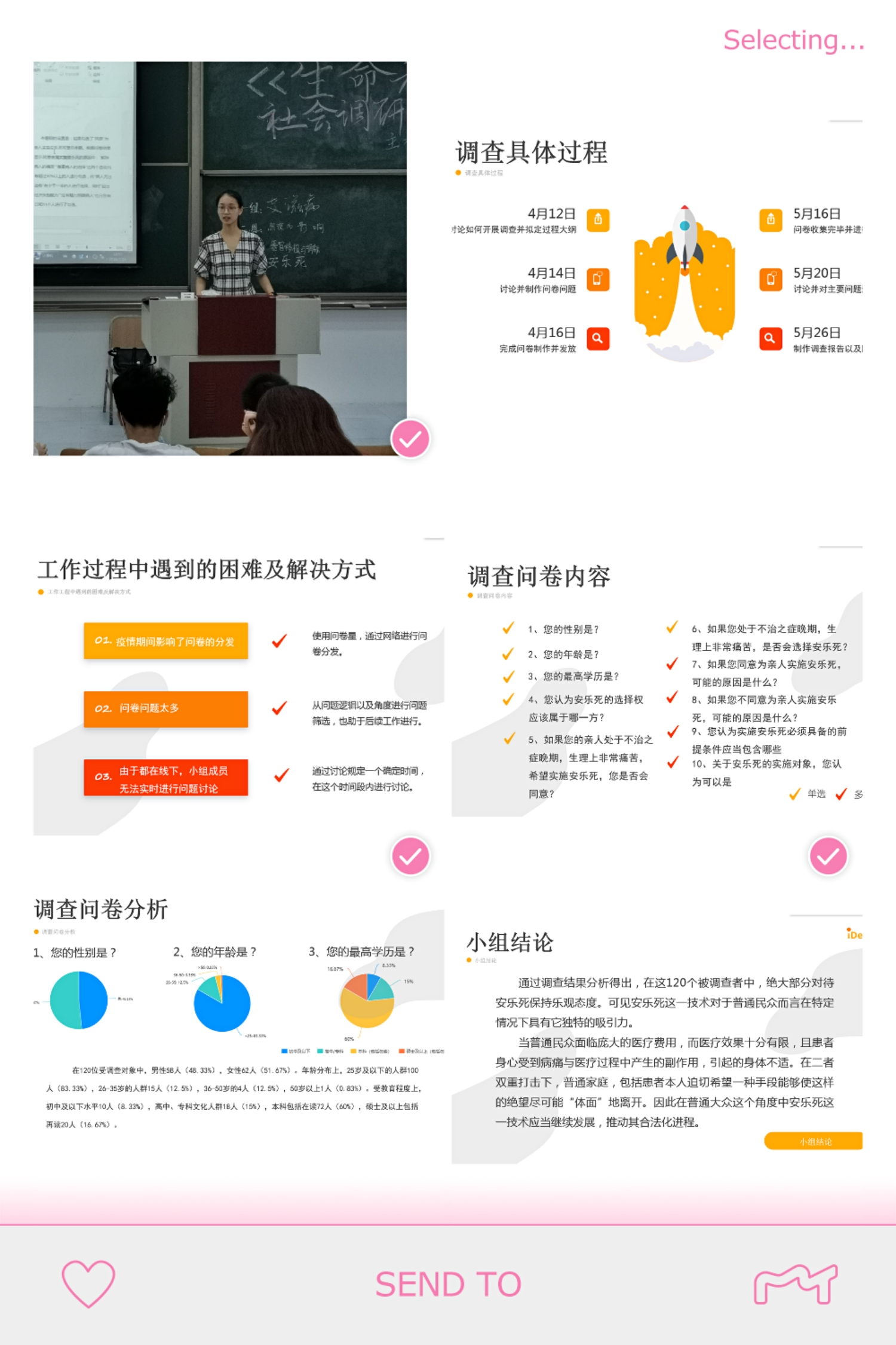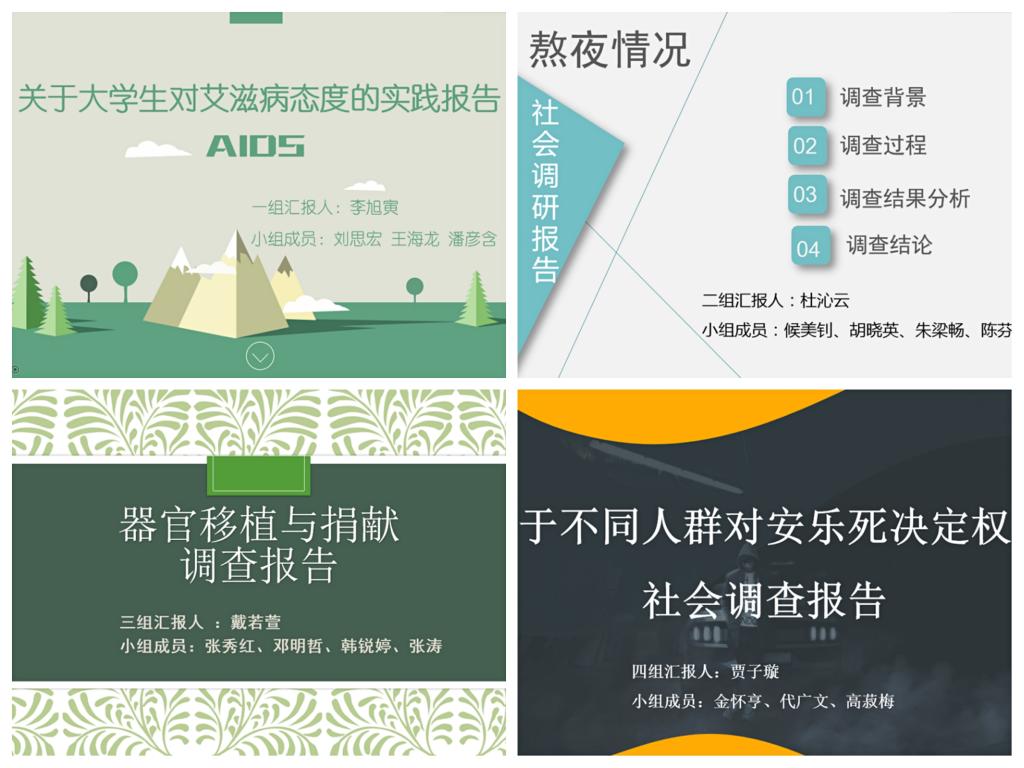 陈春彦老师在总结时谈到,“同学们对社会调研任务态度非常认真、选题别出心裁、分工明确、调查结果分析得当,出色地完成了学习任务,展现了小组团队协作的魅力及大学生的创新精神。通过此次活动,同学们能将社会实践和课堂内容很好地融合起来,将线上课堂延伸到实际生活,补充了课堂之外的知识,加深了对教学内容的理解,同时我相信通过大家亲身调研关于器官捐献、安乐死问题、知艾防艾守护健康等方面的知识,对我们以后的生活有一定的指导意义。另外,请同学们今后要注意问卷的设置一定要紧密结合调研主题,将调查结果分类进行总结,得出相关的调查结论,并提升写作能力与语言表达能力”。