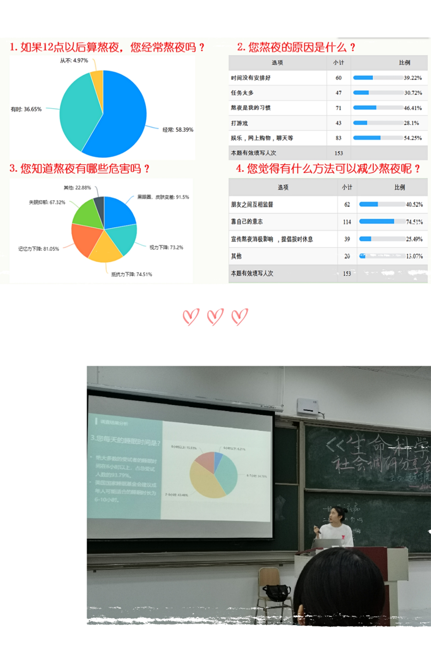 第2组报告人杜沁云,语言流畅、内容熟悉,从熬夜的危害到熬夜的原因分析,再到对避免熬夜的方法进行论证,环环相扣,赢得评委们一致好评。调查结果显示,如果12点以后算熬夜,有58.39%的人表示经常熬夜,36.65%的人表示有时熬夜,仅有4.97%的人表示从不熬夜;54.25%的人将熬夜的时间花在了娱乐项目上;超过25%的人表示熬夜已经成为的他们的习惯。超六成的人认为熬夜会使身心出现各种各样的问题,不仅表现在视力下降、皮肤变差、记忆力下降等方面,还表现在抵抗力降低、失眠抑郁等方面。调查显示不少学生已经意识到了熬夜的严重性,并且已经在努力改正。该小组总结并提出靠自身意志力、朋友之间相互监督等措施来减少熬夜,促进大学生的身心健康发展。