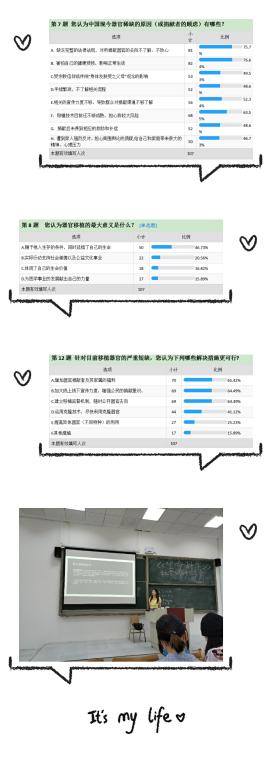 课后采访到第四组汇报人贾子璇同学,她微笑讲道:“这次社会调研分享会圆满结束离不开小组同学们前期充分的准备,大家一起对问卷进行反复地论证和修改,对调查报告进行讨论与补充,PPT呈现的每段文字每个图片都是大家共同努力的结果,很高兴能有此次锻炼的机会,让我能够全程参与社会调查及分享,这将给我未来的学习和生活带来莫大的帮助。”