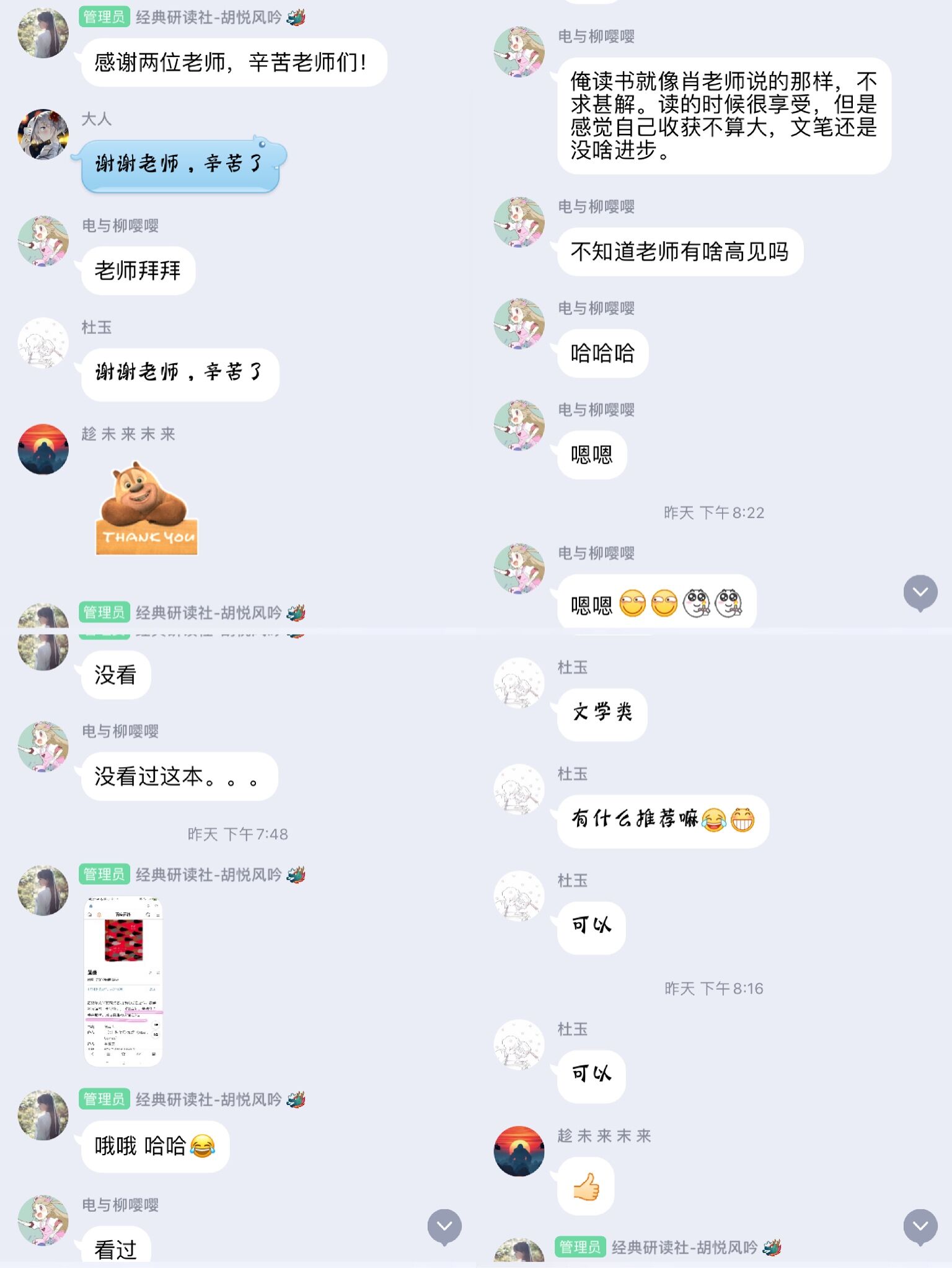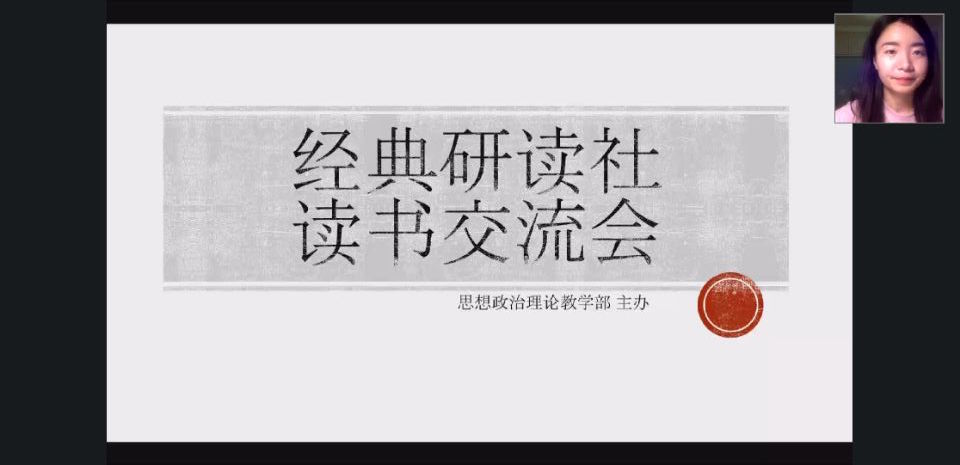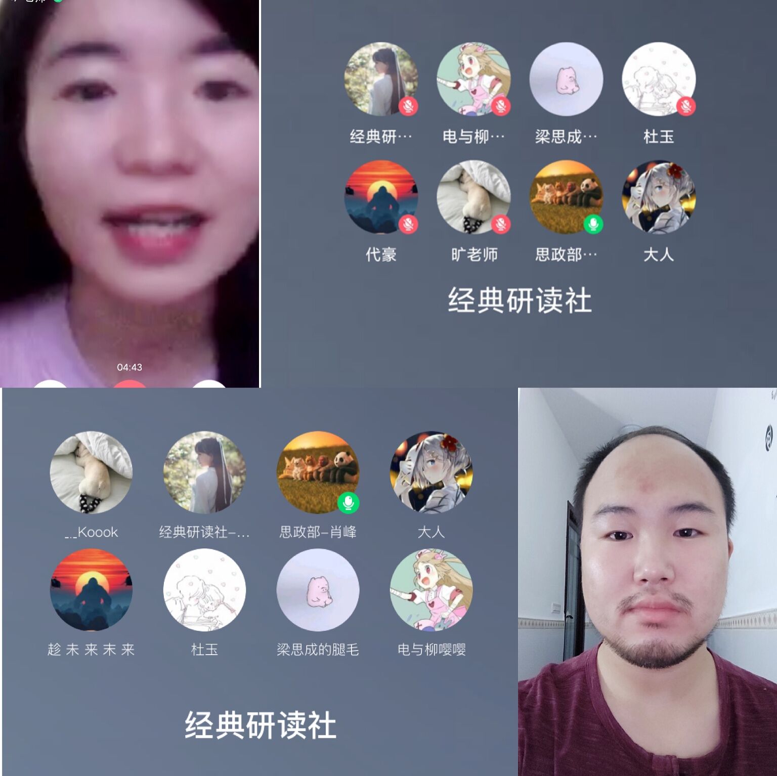 2020年春,举国上下经历了一场惊心动魄的新冠疫情大考,既考验着中国共产党的执政水平,也考验着全体中国人民的整体素养。全民参与到这次艰难抗疫之中,每个移通人也用自己的方式度过了疫情的关键期。为弘扬抗疫精神,鼓励同学们在疫情中不忘学习,6月7号晚上七点半,思政教学部经典研读社指导老师旷媛园在线上组织社团成员开展了一场特别的经典研读交流会,分享在疫情期间所读的经典好书,传递正能量。本次分享会也邀请到了思政教学部政治理论教研室肖峰老师,前来和同学们交流读书体验,鼓励大家读好书、勤思考。