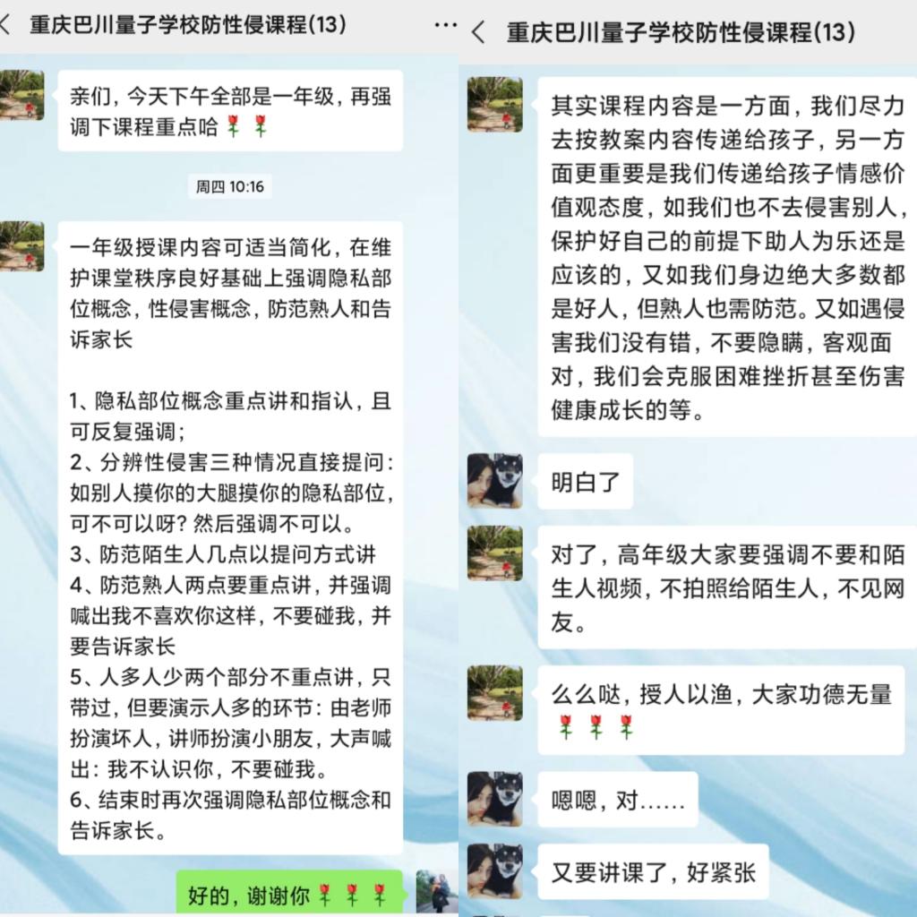 离开巴川量子学校后,杨老师立刻把自己在此次行动前后的感受和体会记录下来,并在线上与北山书院的“女童保护”志愿者们进行了交流。杨老师表示,这次的实践活动中,让她印象最深的是,她从孩子们的言语间看到不少家庭在教育孩子自我保护的时候,会使用恐怖教育的手段。比如,孩子回答问题时,提到“被割掉舌头”“被杀掉”这些恐怖的情节,但其实这样很容易让孩子留下心理阴影。而女童保护的教学内容特别强调,我们要做的是安全教育,不是恐怖教育,也不做冷漠教育。在教给孩子正确的防性侵知识时,还要注意给孩子传递正面积极的情感价值观。当然,杨老师也强调日后大家在一次次的实践中将会有更多这样的体会,也能收获更多的成长。