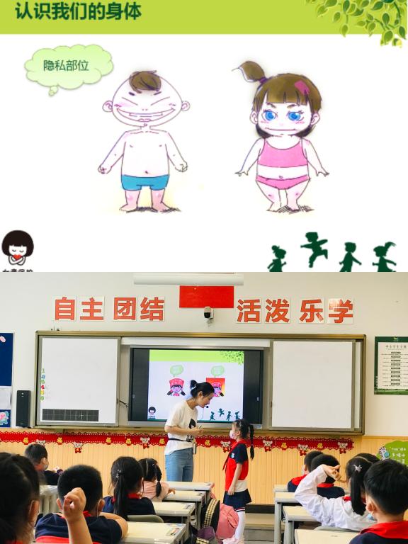 来到小学生的课堂上,杨老师首先以游戏的方式引人,向学生重点介绍了隐私部位的概念,并邀请学生上台指认,强调这些背心和短裤覆盖的地方就是隐私部位,是不能随便让人看和摸的。同时,我们还需要知道如何分辨和防范性侵害。杨老师列举了3种属于性侵害的行为,并从防范陌生人和熟人这两种情况,讲解了如何避免性侵害的一些行为准则。学生在师生扮演的互动中慢慢体会到我们的身体触碰既能传递好的情感,也可能传递不好的情感,人和人的身体接触是需要有界限的。