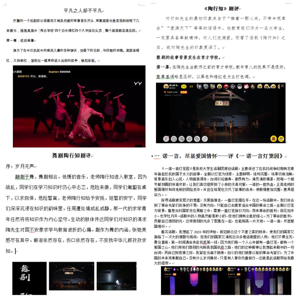 获得一等奖的孙江龙同学在评《一 诺一言灯笼园》中写道:“看完话剧,我想起了2020年的伊始,新冠肺炎这个不速之客的到来,使我们的国家又面临了一次大的难题与挑战,但我们的国家又涌现出许多像话剧里的人物,他们不惧生死,勇往直前,第一时间请命奔赴抗疫第一线,因为他们每一个人心中都有一盏灯笼,都有一个爱国之心,他们用他们微弱的光照亮我国抗疫之路,他们的这种精神让我想起来剧中的一句台词:民族已到危难之际,我辈定当奋不顾身。”