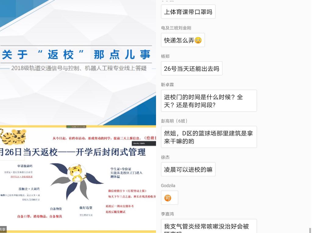 从返校注意事项到校园防护措施,从生活环境到学习心理,每位辅导员都尽心尽力回答学生和家长关切的问题。其中,2019级辅导员刘桃和孙良顺进一步从学业呼吁学生重视学习,强化自律,通过单独沟通,引导学生明白学业规划的重要性。2018级辅导员郭超然以生命安全为主线,收集学生复学疑问,以便后续工作开展;2018级辅导员郭菲从注意事项、学习叮嘱和心理舒缓等方面帮助同学们了解相关事宜安排,重新审视自我,明确学习目标,树立自信。同时希望同学们积极调整自我状态,学会观察情绪的发生、变化,学习把注意力转移到当下正在做的事情上,舒缓不良情绪;2018级辅导员向姝重点强调返校后的心理调整和生活作息,期望同学们能够守望相助,自律自觉遵守条例,以宽容之心对待身边的人。