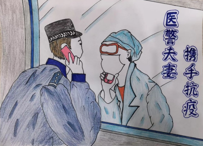 这是一幅素描画,疫情期间,一对母子分别在隔离房的内外,里面是正处在抗击疫情一线的医生母亲,外面是正在准备着今年高考的儿子,他们隔着厚厚的玻璃跟对方打着电话,报着平安。