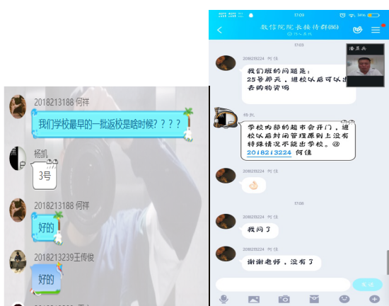 返校之后食品问题和生活问题是同学们比较关心的问题,有同学提出关于食堂菜品种类是否同上学期一样还是会减少,学校超市生活用品是否其齐全,价格是否上涨等。潘显兵教授回应道学校食堂菜品每天都会不相同,菜品数量及生活用品数量及价格上都会相对公平。开学之后会进行补考,有同学提出开学后关于补考采取线上考试还是线下考试,对此老师回应到,补考时间已经固定在19号,具体安排可以在指尖移通进行查看。会议最后,廖阳老师提出关于当天返回学校的课程能否给予停课或后面补课。潘显兵教授对此回应到返校当天给予停课,后面老师自行补课,同时也会向校领导反应。