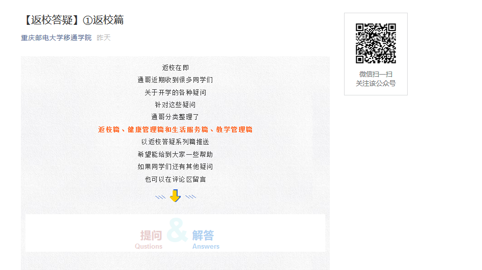 对于返校更多细节问题,我校微信公众号:重庆邮电大学移通学院,也会陆续发布返校答疑系列推送。一去名门学海涯, 苦历数载终归家。因受新冠肺炎疫情影响,沉寂了将近4个月的校园,在不久后又将重现琅琅的读书声。为进一步落实疫情防控工作,严防疫情输入校园,确保我校的安全与稳定。此次返校学校领导和老师已经过多次演练,通过新冠肺炎防控知识培训、强化细节、完善预案等流程,切实保障师生平安返校,暖心归“家”。