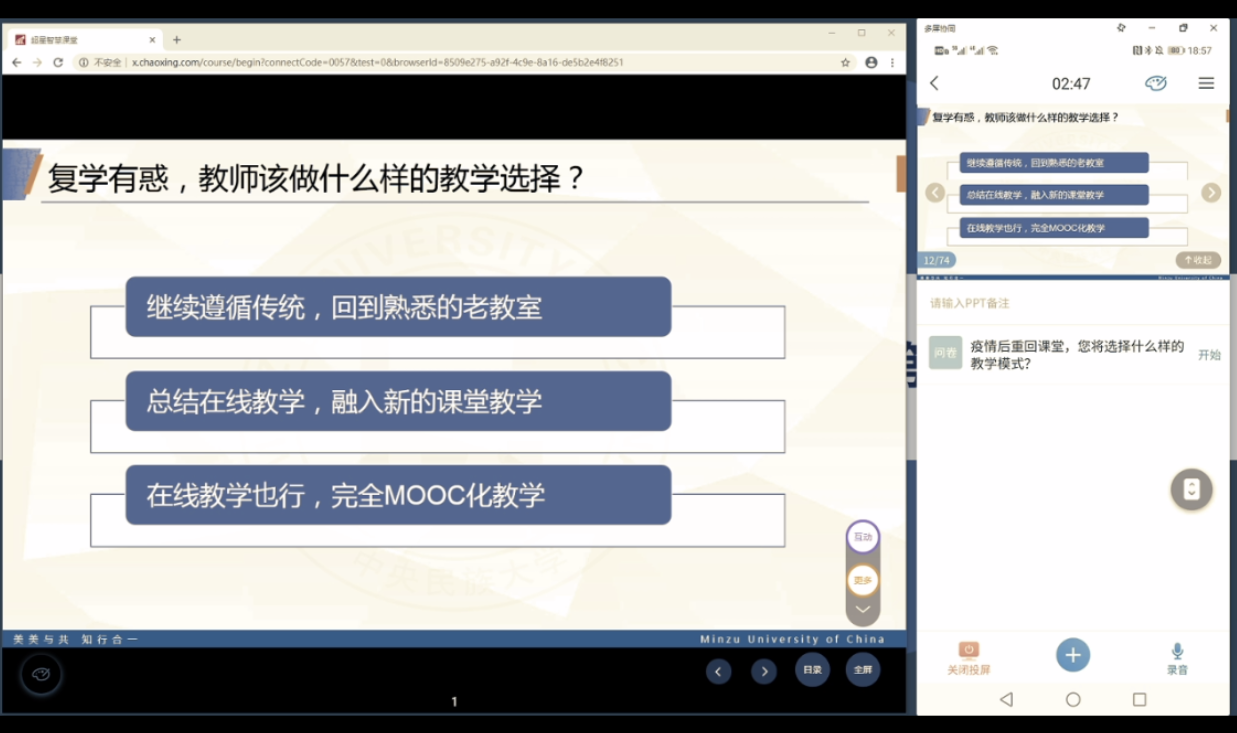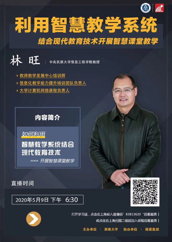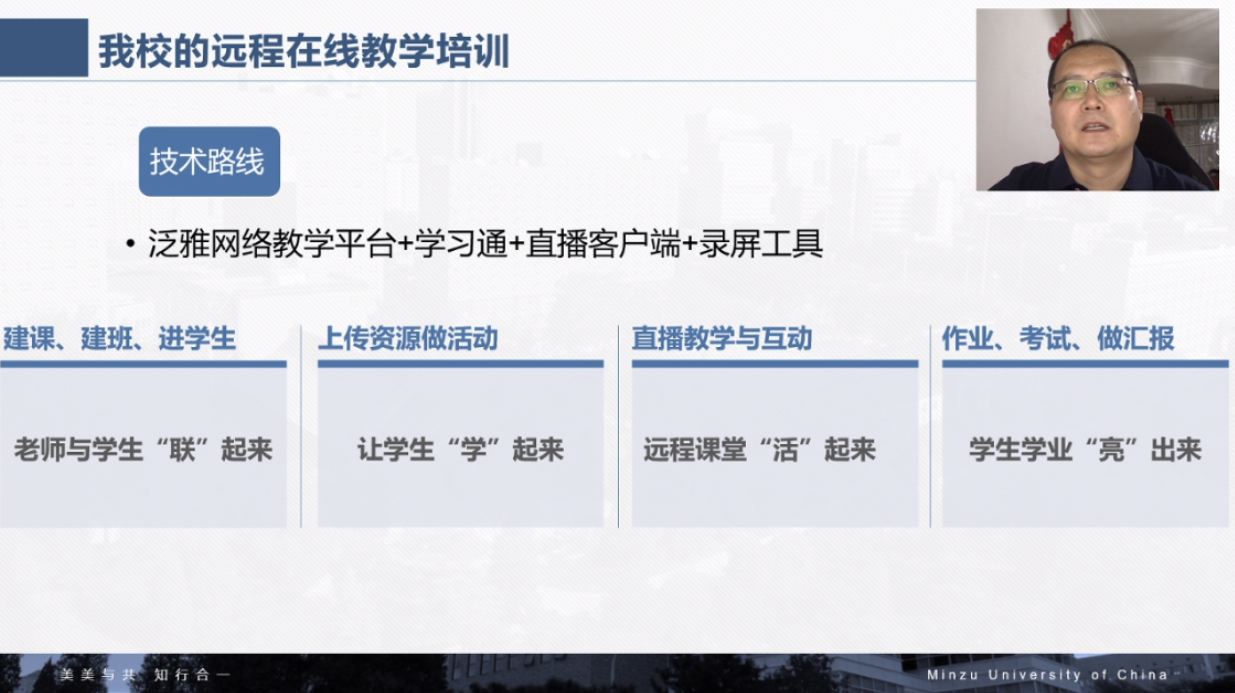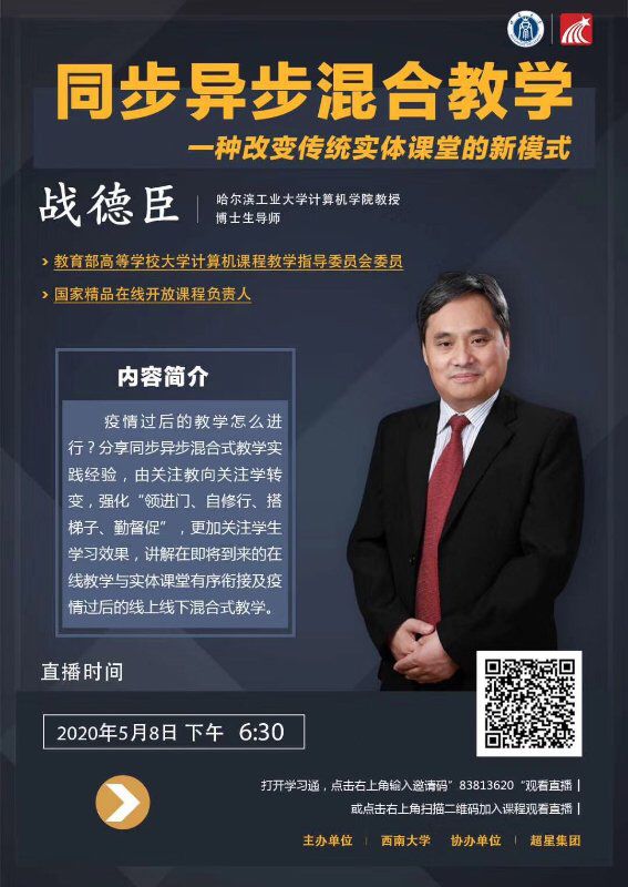 5月8日、9日,哈尔滨工业大学教授、教育部大学计算机学院战德臣教授与中央民族大学信息工程学院林旺教授分别做客学习通直播平台,以“同步异步混合,打造高效的在线教学新模式”和“智慧教学—课堂信息化实践与评价”为题,在线为教师们进行了深入而富有成效的培训。我院全体任课教师参加了这两次培训。