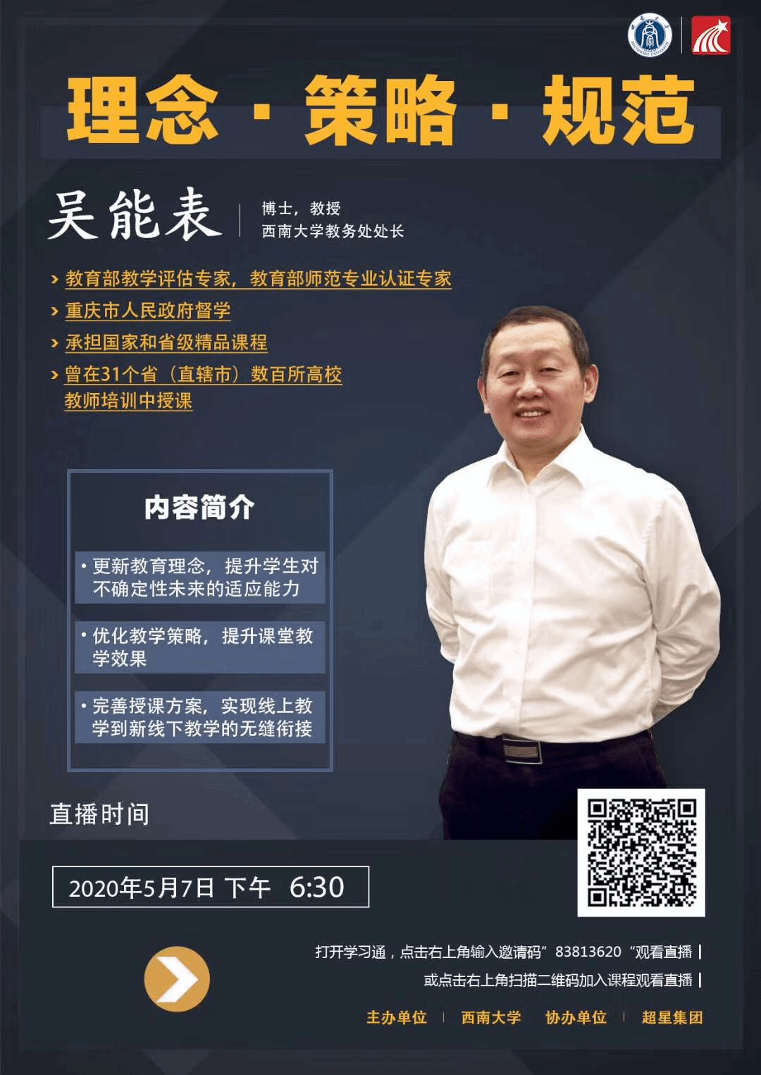 . 随着高校的陆续复课,如何做好前期的线上教学与学生返校后的课堂教学的衔接工作也将提上议事日程。接下来中德学院也将面临复课后线上线下教学衔接问题,作为教师,我们应该又为课堂进行哪些部署?5月7日,西南大学教务处处长吴能表教授在以“完善授课方案,实现线上教学到新线下教学的无缝衔接”为题的培训会中分享了他的经验。