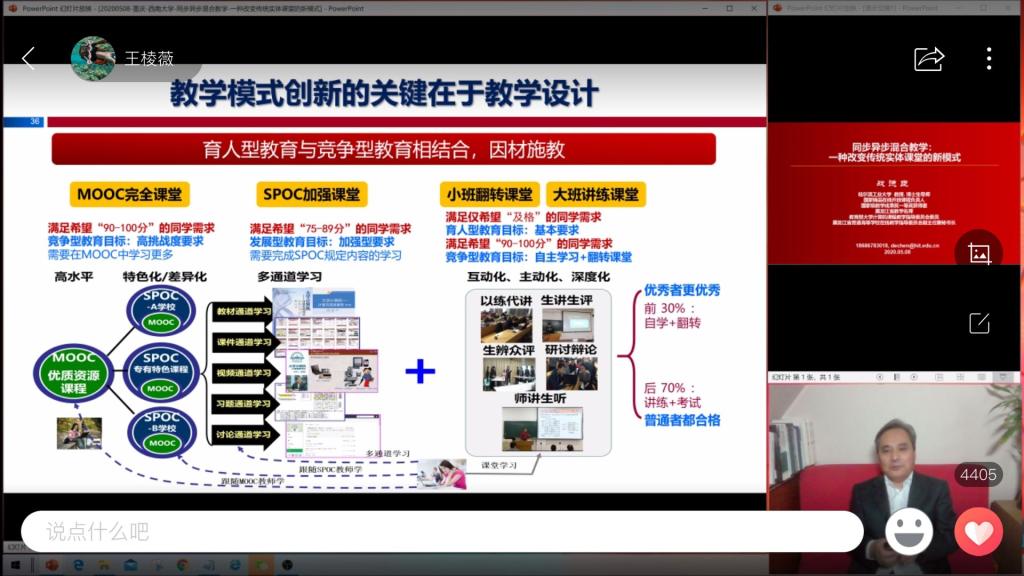 培训会中,战德臣教授首先分析了现在实体课堂教学中存在的不足,指出解决“教”与“学”的平衡需进行线上线下相结合的混合式教学模式。随后,他根据在线教学的形式与特点,分别详细讲解了基于MOOC和SPOC的在线翻转课堂教学模式,并分享了在线教学如何关注学生学习效果以及在线教学如何考试等具体问题。战德臣指出,在线课堂教学效果取决于教师的教学设计、整体课堂安排以及教学活动的设计,同时应注重教学理论与实践的结合。