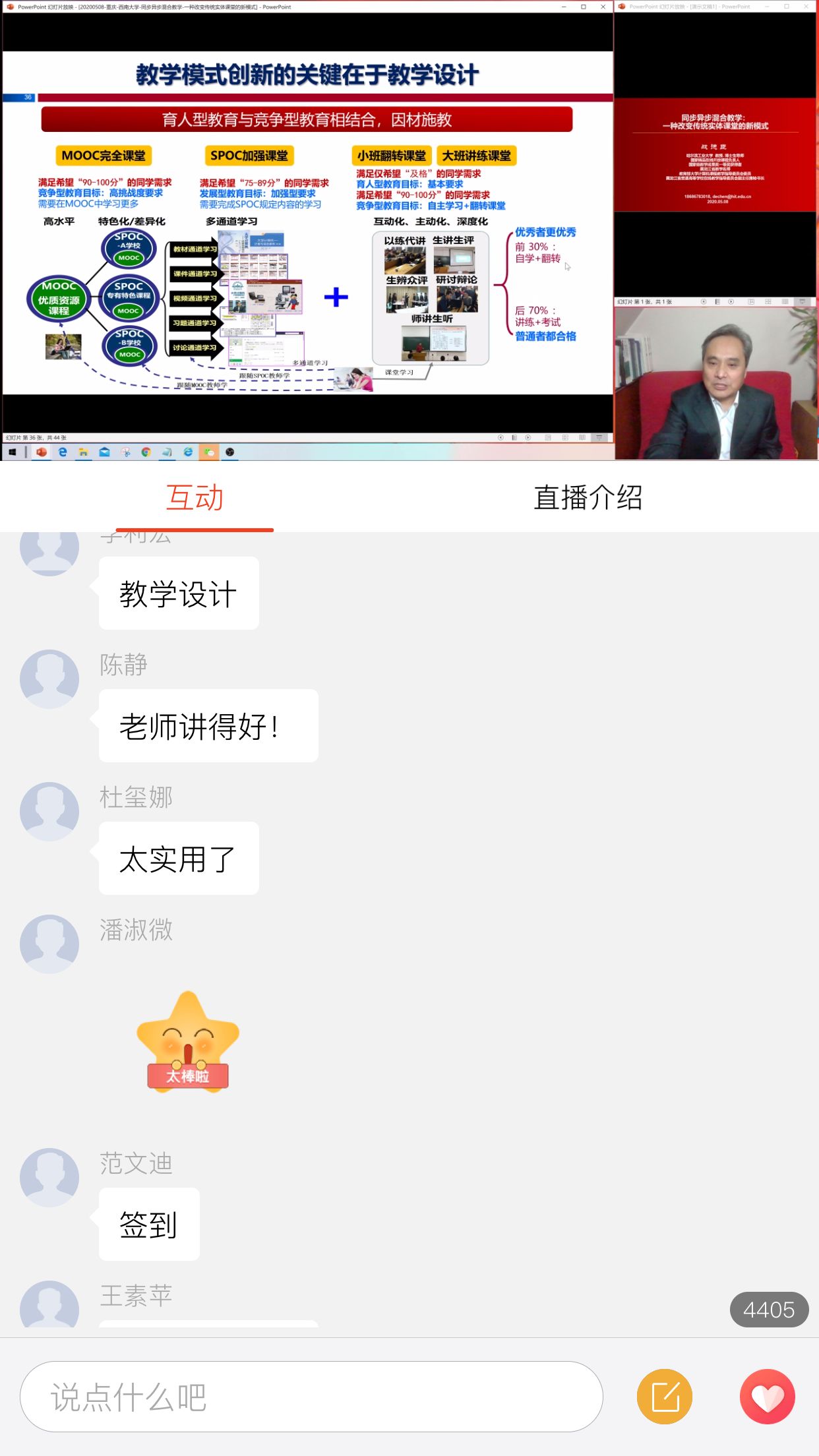 林旺教授则针对教学改革中的“痛点”,并结合自身使用超星泛雅平台和学习通进行线上教学的实践,与大家分享了采用信息化教学方法改进线上课堂教学的思路和有益尝试,并介绍了手机端学习通的实战教学运用。他通过教学数据的应用和分析,为老师们展现了信息技术与课堂教学融合的趋势与魅力。林教授的讲解有效地解决了我院教师近段时间线上教学工作中的一些“痛点“,解决了教师们使用网络教学资源平台的难题。