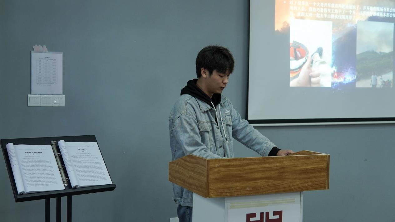 分享会上,线上、线下的“读者们”与主持人任旺共同“阅读”申鹏同学带来的《执着于理想,纯粹于当下》,火势弥漫,山路蜿蜒,几十里骑行来回辗转,拉运物资,接送志愿者,一颗颗汗水浸湿衣衫,从未停歇;唐鑫同学带来《如果结果不如你所愿,那就在尘埃落定前奋力一搏》,直面山火,勇毅前行,千万次摔倒,仍昂头赴红光一片,将一位位医护人员送往前线;汪宇航同学则带来《青衿之志,屡践志远》,不畏崎岖山路,不畏火焰灼伤,长达100多个小时山火炙热中,徒手挖掘隔离带,直至火情完全控制。他们在烈火的“热度”中体现青年的“温度”,用行动为诠释了“勇敢”一词的含义,以青年之力筑成了一道道防火的“城墙”。