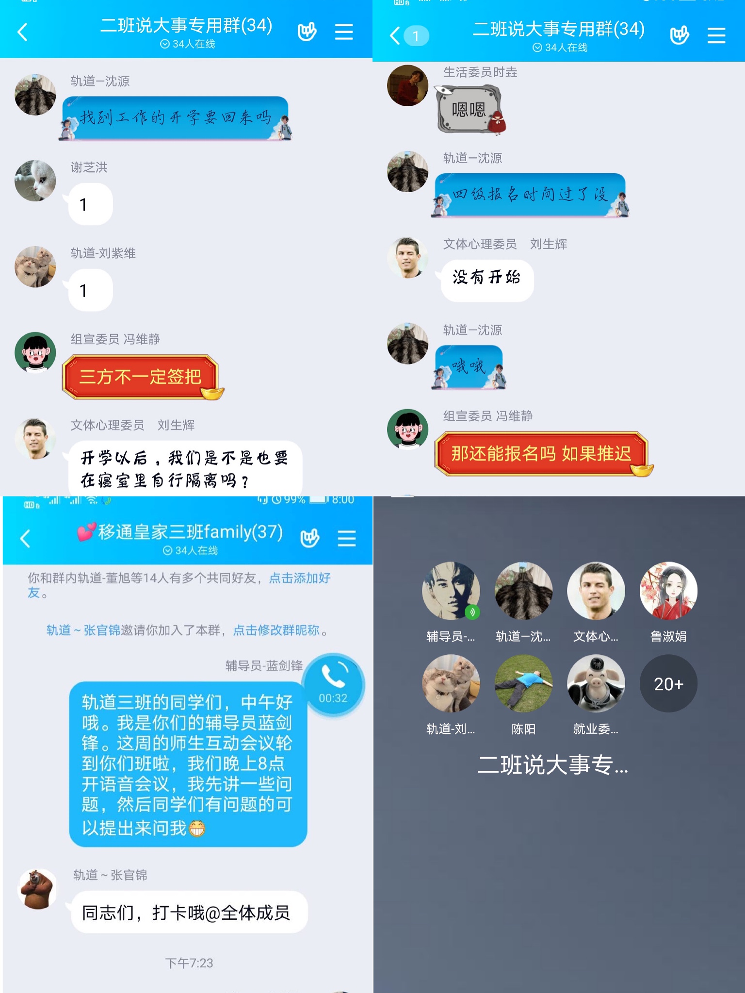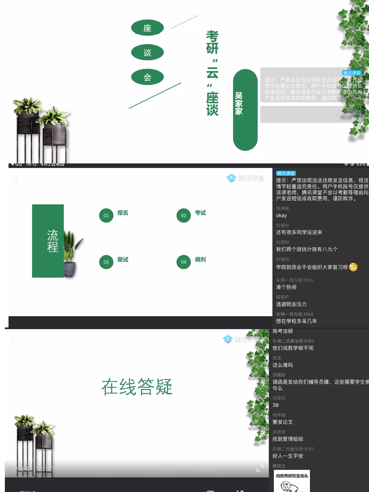 辅导员吴家家针对部分有考研打算的2017级学子开展小型考研“云”座谈。引导同学们认清考研初心,进行自我能力评估、预判和定位,从考研的报名流程、时间节点、复习资料等角度来讲解细节,从学院历年的考研数据理性分析成功率并鼓励大家遵从内心,切忌盲目跟风、随波逐流,做好人生规划,脚踏实地;辅导员张颖超以寝室为单位持续开展简历修改计划,现已覆盖全部同学。摸排就业意向、一对一修改简历、了解学生近况,拉近与学生间的距离,感情联结加深的基础上有针对性的提出建议和指导;粟丹老师结合专业定位和自身经历,以深入交流的方式对学生的就业意向和疑惑进行解答,着重对学生进行心理压力的疏解,愿每位同学未来能有作为。