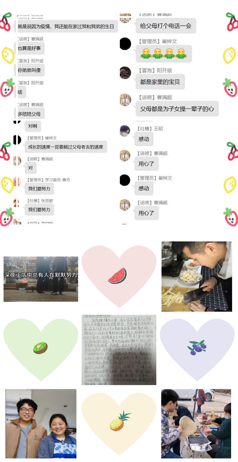 完满教育,彰显新时代大学生责任感。4月7日,2018级辅导员郭超然和电气工程及其自动化02团支部,创新疫情期间完超活动主题,利用班级群以“回忆往昔·共赴时光之旅”为话题开展活动。活动要求同学们与父母一起参与,通过分享名字背后的故事、时代老歌、疫情期间与父母相处的趣事以及读给父母写的信等多个环节,使同学们学会感恩和理解,也让父母看到同学们的成长,感受到完满教育的温暖。